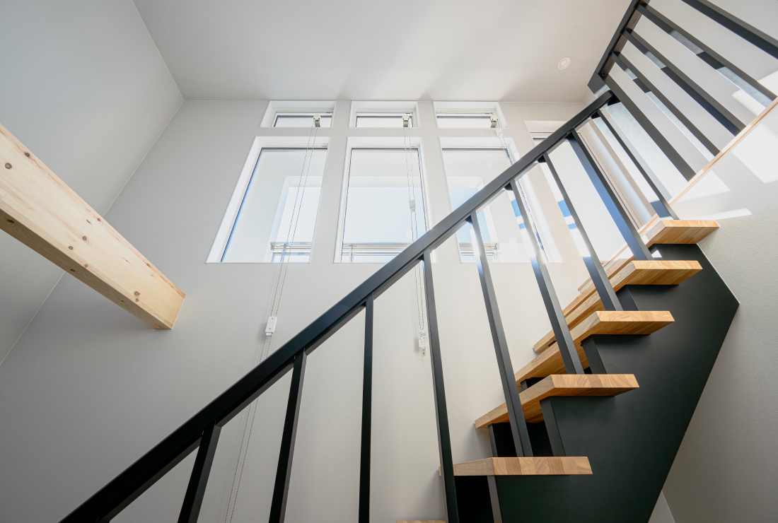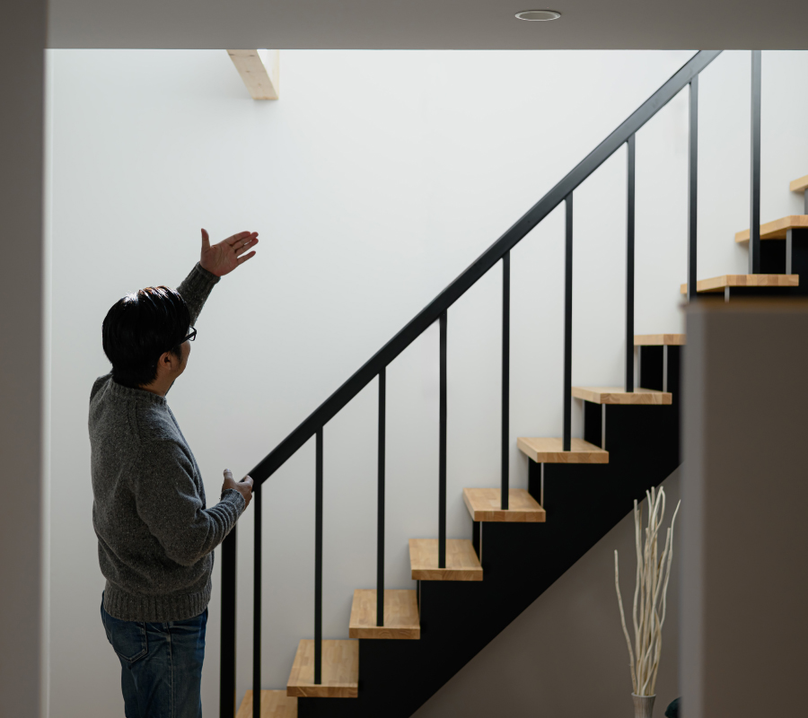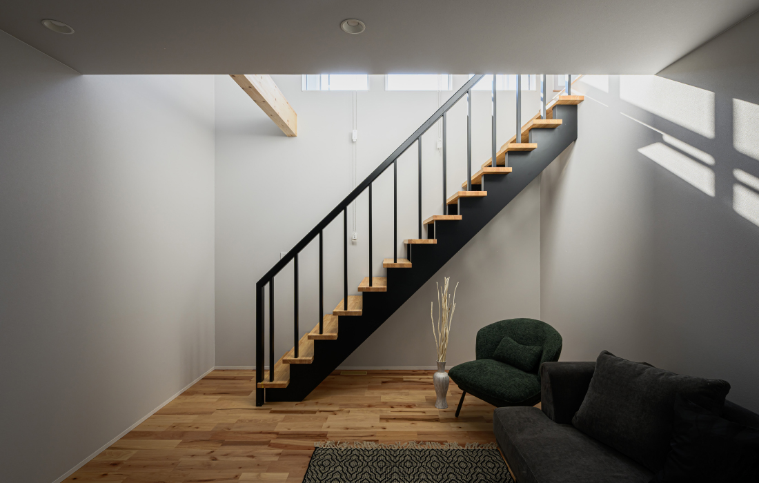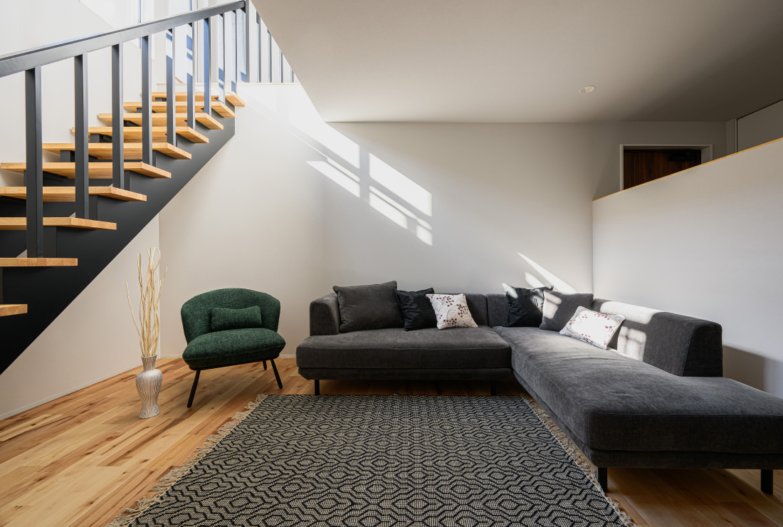 階段から降り注ぐ陽光は、軒の出を計算して、夏は遮り、冬はリビングの奥深くまで日向を作り出します。「なんか落ち着く」空間でありながら、日の入り方で季節を感じられる、いつまでも住み心地のよい家を是非、体感されてください。