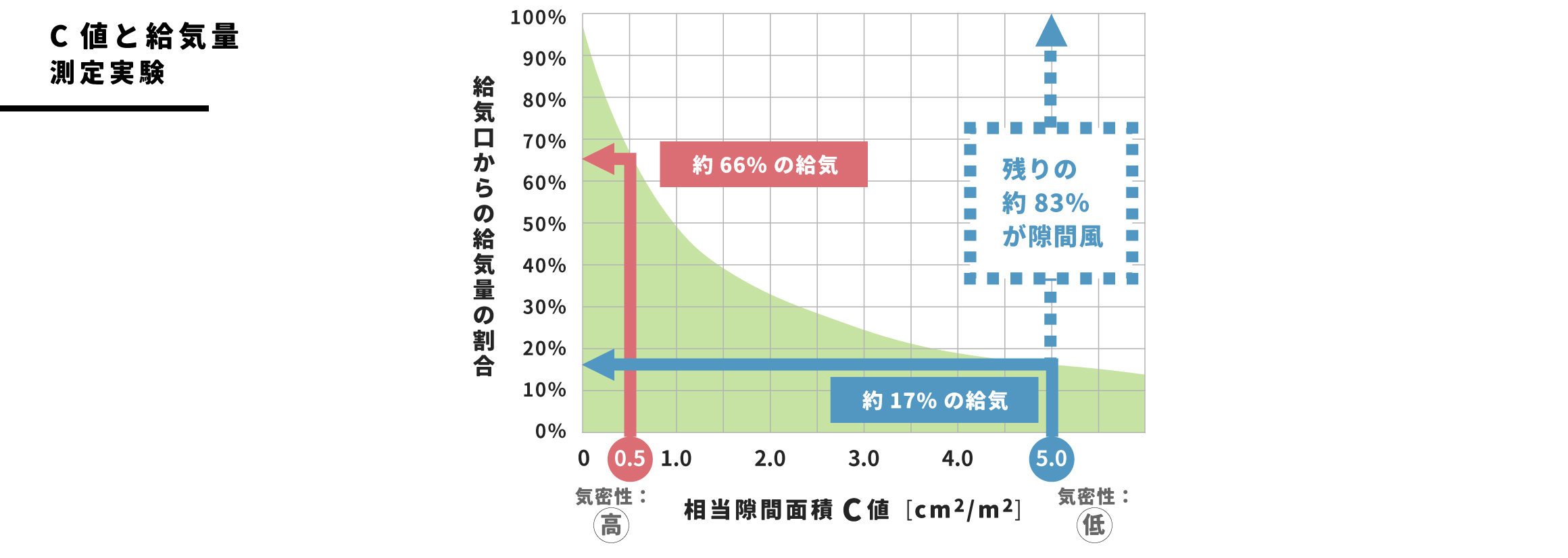高断熱・高気密住宅では、24時間換気で常に新鮮な空気を室内に取り入れることで、シックハウス症候群の原因となる化学物質は希釈され健康に過ごすことができます。この24時間換気を正常に稼働させるには「気密性能」が大きく関わってきます。24時間換気には給気口と排気口があり、家の形や間取りに合わせて効率的な換気ができるように換気経路が設計されます。しかし、この換気経路は気密性能の悪い家だと、設計通りの換気をしてくれません。下図の例では、C値(*)5.0㎠/㎡の家だと約17%程度しか換気の給気口から給気されておらず、残り83%は、家中の隙間から給気していることになります。これでは住宅のいたる所の隙間から熱の出入りを許してしまい、せっかく設計した換気経路も計画通りの効果を得られません。24時間換気を正常に稼働させるためにも「気密性能の高さ」が必要不可欠といえます。