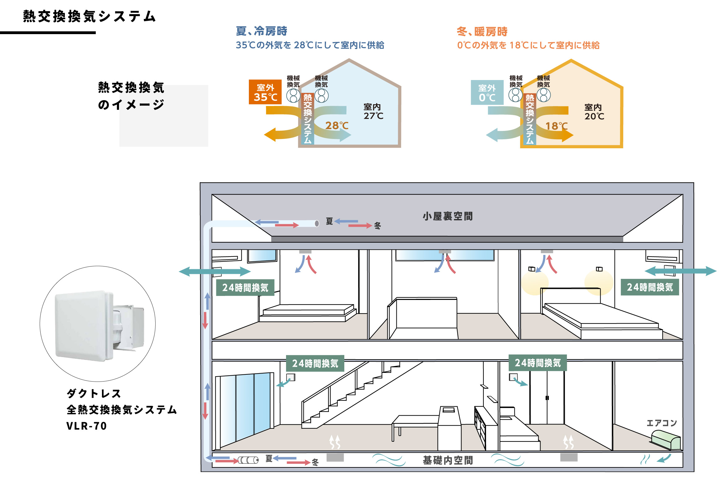 夏/外気温35℃・室温27℃の場合:外気は35℃のままではなく、28℃程度まで下がってから室内に給気されます。