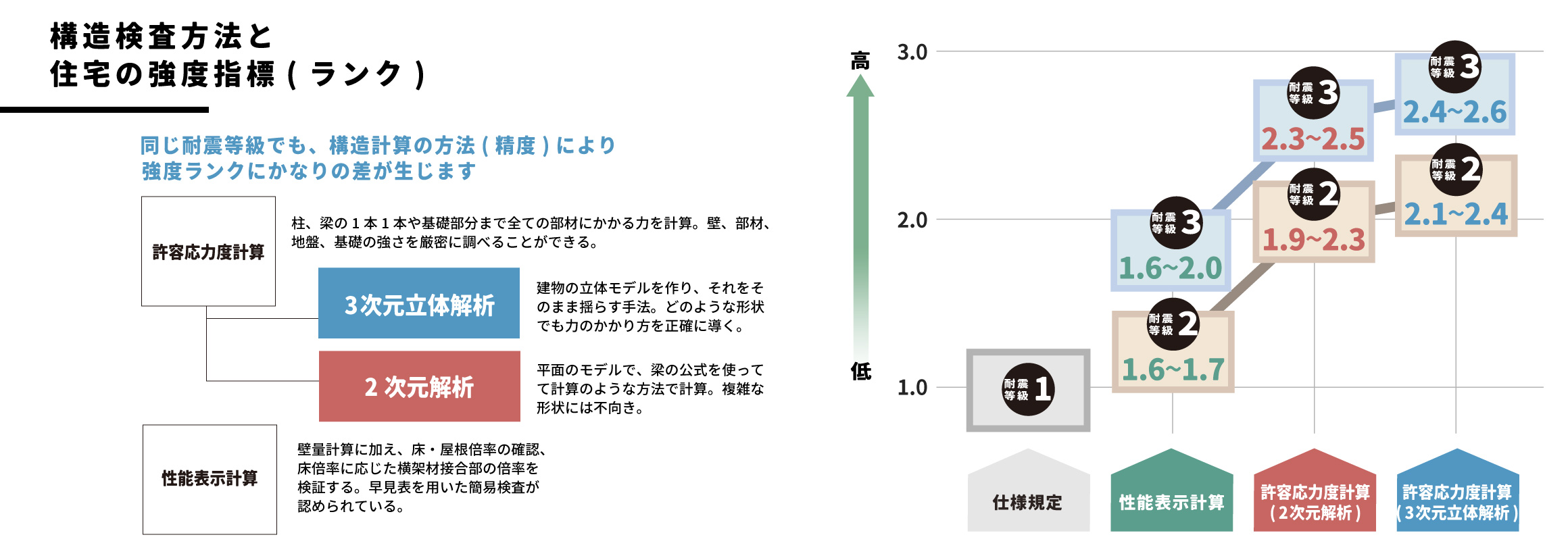 図のように、同じ耐震等級でも、構造計算の方法(精度)により実際の強度ランクにかなりの差が生じます。樹の家こころ舎では「三次元立体解析」を採用していますので、耐震等級3でも最高レベルの(建築基準法耐震等級1レベルに対し)2.5倍近くの強度を実現しています。