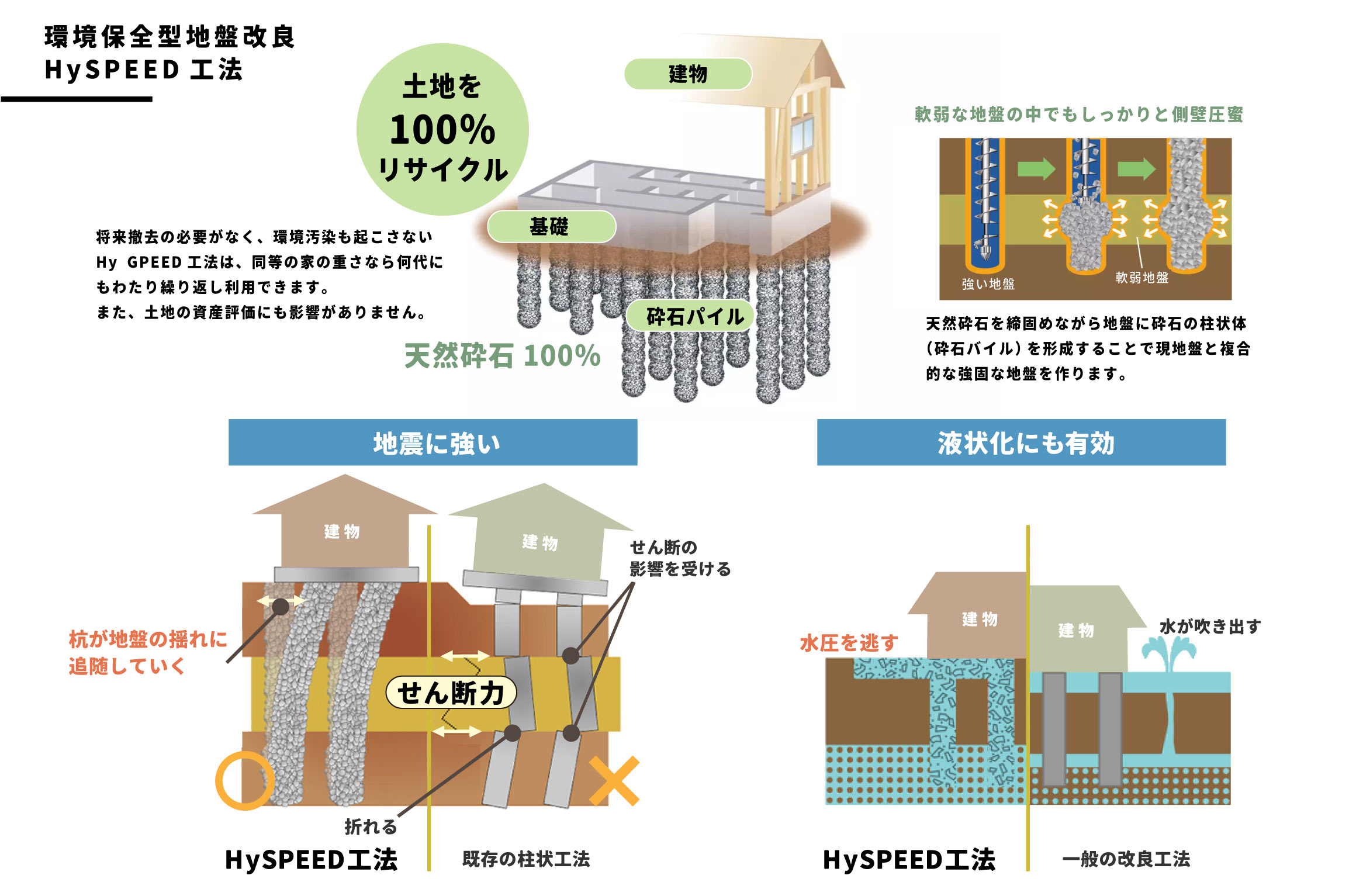 地盤改良工法「HySPEED工法」は、セメントなどの固結材を一切使わずに、砕石という天然素材だけを利用して軟弱地盤を改良する工法です。固結材(セメント・石灰)などの化学反応を利用した工法ではなく、天然素材を使用することで、土壌・地下水などの汚染の心配がなく、建替えの際に撤去する必要がなく撤去費用がかからないため、トータルコストの減少にもつながります。地震などの災害面にも強く、砕石はせん断に対して追随するかたちで衝撃を流すため、破損が起こりません。液状化被害を低減する効果もあり、過去の震災時には不同沈下の被害が少なく済んでいる実績もあります。安心・安全に特化した地盤改良工法で建物資産を守ります。
