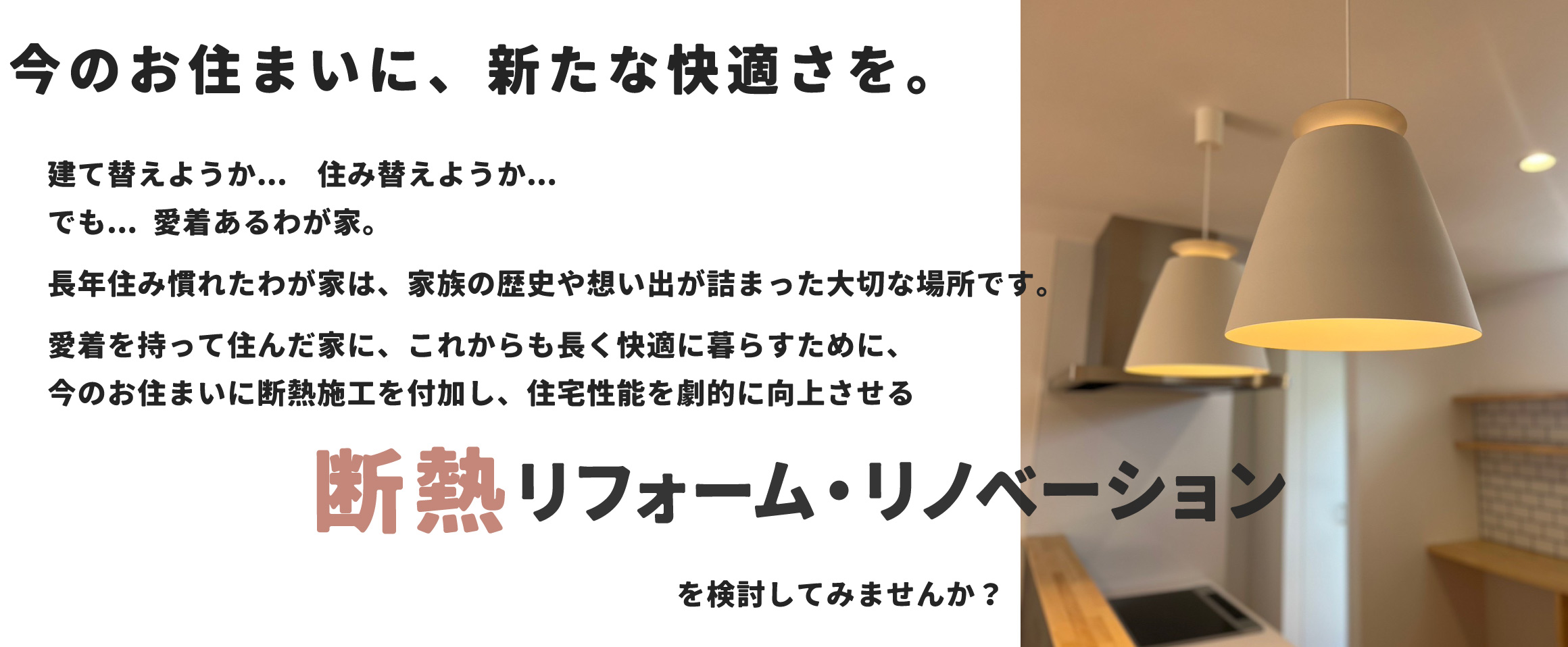 樹の家こころ舎では、高気密・高断熱の注文住宅を提供する工務店としてその技術を活かし、既存住宅にも断熱技術を付加することで『夏は涼しく、冬は暖かい』一年中心地よい室温が保たれる室内環境を実現する「断熱リフォーム・リノベーション」をご提案しています。