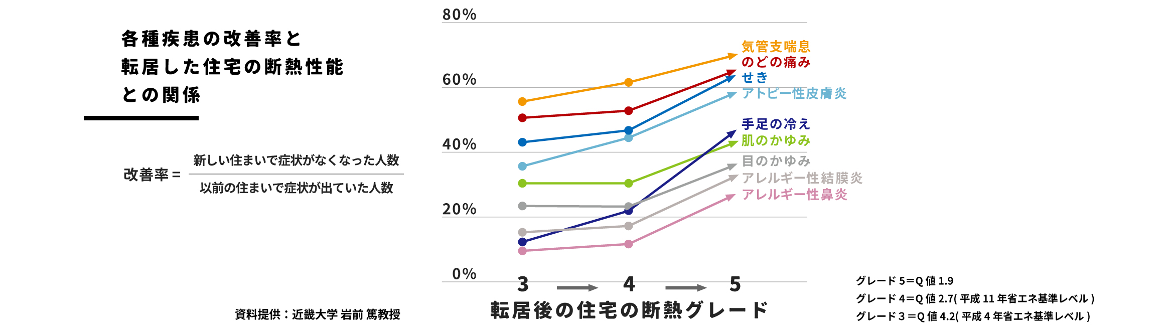 下図は右へ行くほど断熱性能が高いことを表します。脳血管疾患や心疾患のように生死に関わることだけでなく、老若男女が日常的に経験する軽い疾患においても断熱性能が良い家に引っ越すと症状が改善する人の割合は増えていきます。このように、1年のうちで最も長い期間を占める冬の室温をいかに暖かくするかは、日常の健康から生死に至るまで多岐にわたって影響を与えます。断熱性能を高めて家を暖かくすることで、肌の乾燥を防ぎ血行も良くなります。皮膚のかゆみ、風邪、腰痛などの症状が軽減するという事例も多くあります。