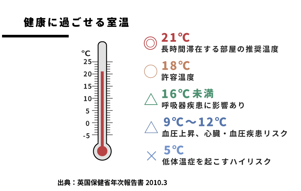 上図のように、イギリスでは健康に過ごせる室温推奨値を21°C、18°Cまでが許容できる室温。16°C未満では呼吸器系の疾患に悪影響があり、12°C以下では血圧や心臓・血管の疾患の危険が高まるとしています。一方日本はどうでしょう?冬場最低室温が10°C以下になる家も珍しくはありません。10°C以下はイギリスの指標では「低体温症を起こす」ほど危険な寒さです。このように室温・部屋間の温度差は健康リスクと大きな関係があります。大切な家族を守るために住まいの温熱環境(室温)ついて考えてみることはとても重要です。